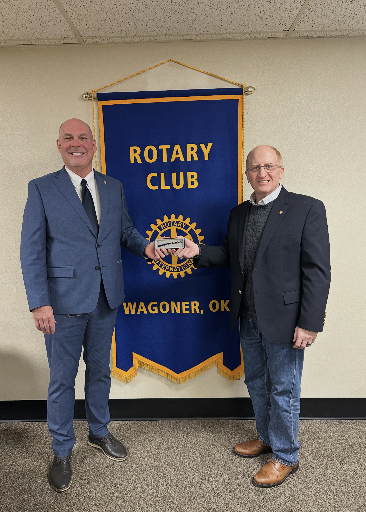 Pictured: Hon. Douglas Kirkley being presented with a Rotary pen by Wagoner Rotary President Rick Moore.
